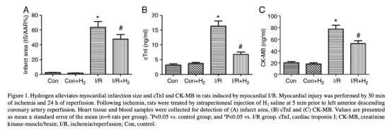 1 心肌梗死面積和心肌酶數據來自圖1。研究意義是直接評估心肌損傷程度,顯示氫能顯著減少梗死面積和降低cTnI、CK-MB水平,表明氫對心肌有保護作用。