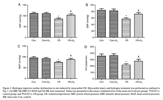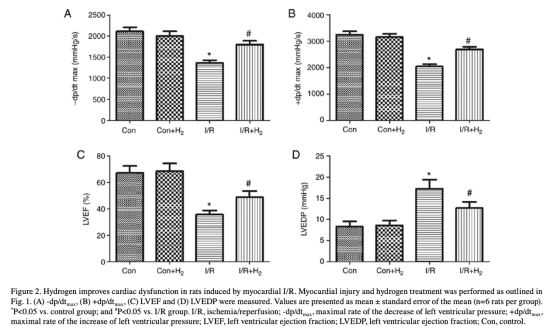 2 心臟功能和血流動力學數據來自圖2和圖3。研究意義是量化心臟收縮和舒張功能,氫改善±dp/dtmax、LVEF、LVEDP等參數,說明氫能恢復心臟泵血能力。