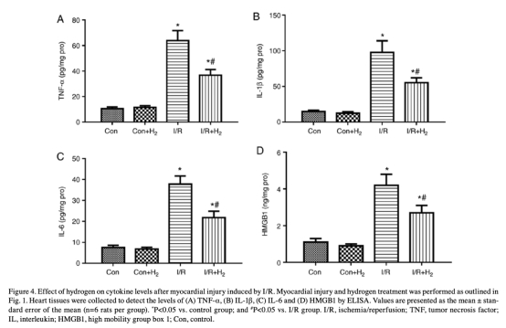 3 細胞因子水平數據來自圖4。研究意義是評估炎癥反應,氫降低TNF-α、IL-1β、IL-6和HMGB1水平,表明氫具有抗炎特性。