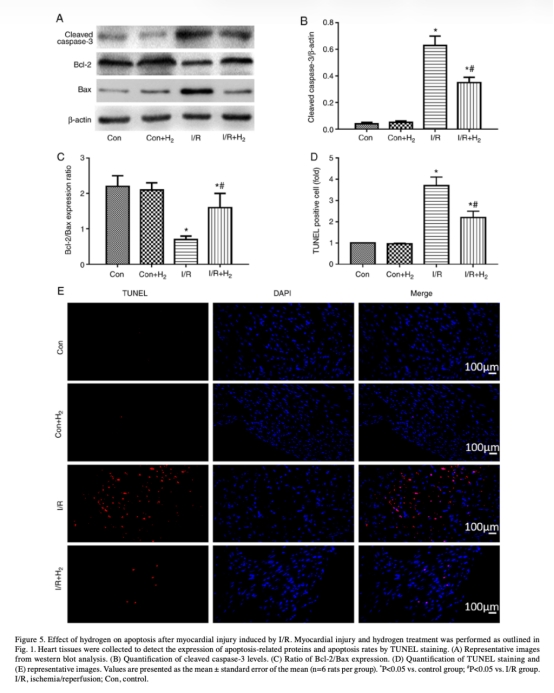 4 凋亡相關數據來自圖5。研究意義是分析細胞死亡機制,氫減少caspase-3表達、提高Bcl-2/Bax比率和降低TUNEL陽性細胞數,證實氫抑制凋亡。