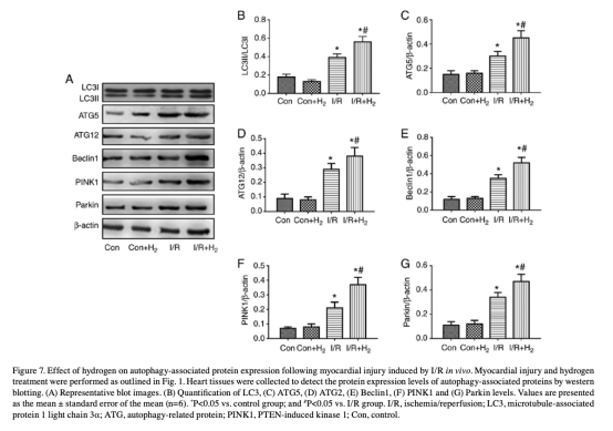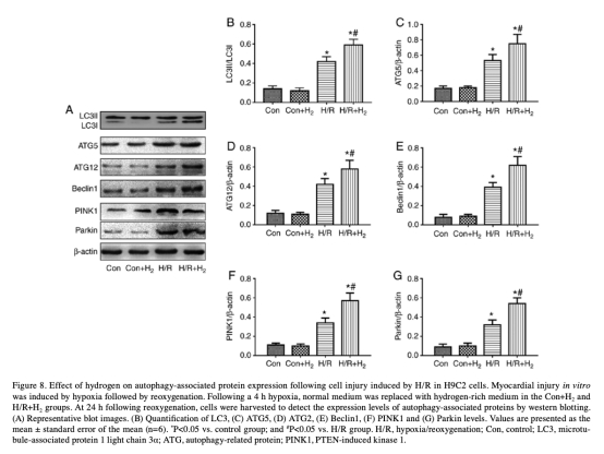 6 自噬相關蛋白表達數據來自圖7和圖8。研究意義是探索分子機制,氫上調LC3、ATG5、ATG12、Beclin1、PINK1和Parkin蛋白,表明氫激活自噬通路。