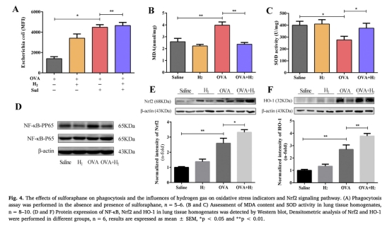 這篇論文研究了氫氣體(H2)吸入對卵清蛋白(OVA)誘導的哮喘模型中肺泡巨噬細胞吞噬功能的影響。摘要指出,哮喘患者肺泡巨噬細胞的吞噬能力顯著降低,這與氧化應激增加有關。氫氣體作為一種選擇性抗氧化劑,具有抗氧化和抗炎作用。研究通過小鼠哮喘模型發現,氫氣體吸入能增強肺泡巨噬細胞吞噬功能,減輕氣道高反應性、炎癥和杯狀細胞增生,降低TH2反應和IL-4及IgE水平,減少丙二醛(MDA)產生并增加超氧化物歧化酶(SOD)活性。同時,氫氣體吸入抑制NF-κB活化并激活Nrf2通路。結果表明,氫氣體吸入通過抗氧化作用和Nrf2通路激活增強肺泡巨噬細胞吞噬,為哮喘治療提供新策略。