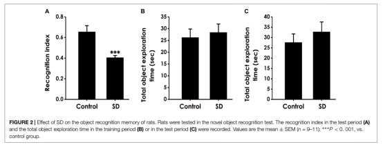 2 新物體識別測試數據來自圖2,顯示SD組識別指數降低,但總探索時間無變化。研究意義是表明SD影響識別記憶,而非探索動機。