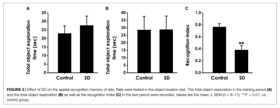 3 物體位置測試數據來自圖3,顯示SD組位置記憶識別指數降低。研究意義是證明SD導致空間記憶缺陷。