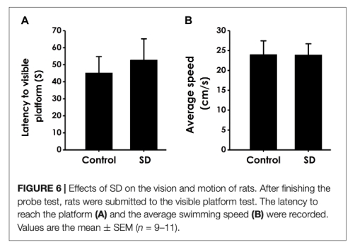 5 視覺平臺測試數據來自圖6,顯示SD組逃避潛伏期和游泳速度無差異。研究意義是排除視覺和運動能力變化對認知結果的混淆。