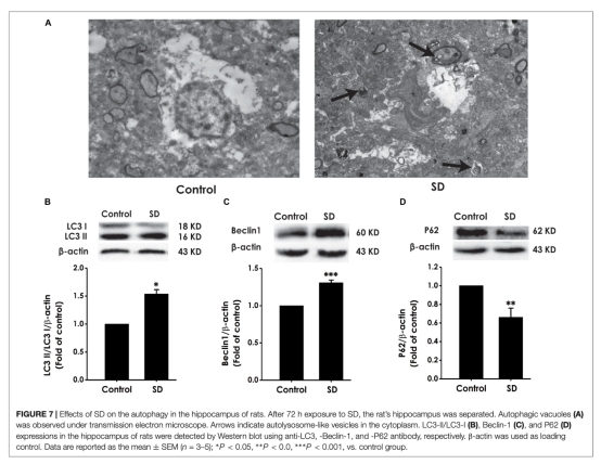 6 自噬相關數據來自圖7,顯示SD組海馬體自噬小體增加、LC3-II/LC3-I比率和Beclin-1表達上調、p62表達下調。研究意義是證實SD引起海馬體過度自噬,與認知障礙相關。