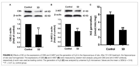 7 H2S生成數據來自圖8,顯示SD組海馬體CBS和3-MST表達下降、內源性H2S生成減少。研究意義是表明H2S生成抑制可能參與SD誘導的認知障礙機制。