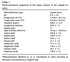 野外采樣與背景調(diào)查:在 Laguna Brava 特定地點采集具有層狀結(jié)構(gòu)的活體微生物墊,并測定水體的基本理化參數(shù)(Table 1)。