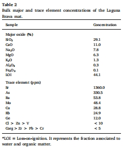 整體組分分析:使用X射線衍射(XRD)和整體元素分析(ICP-MS/OES)確定微生物墊的礦物組成(文石為主)和主要及痕量元素含量(Table 2)。