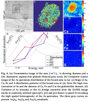 數(shù)據(jù):As(III) 和 As(V) 的分離圖譜,以及在一個有機質(zhì)球狀體(Figure 6)中高砷但缺乏其他金屬的信號。