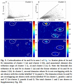 研究意義:定量化地證實了砷與鐵的相關(guān)性并非普遍存在,而是具有雙重模式:一部分砷與鐵熱點緊密相關(guān)(可能代表吸附在鐵礦物上),另一部分則呈現(xiàn)彌散的相關(guān)性(可能代表從降解的EPS中釋放出來),深化了對砷固-解過程的理解。