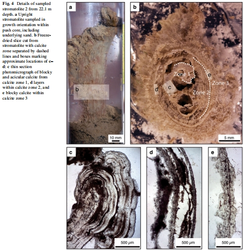疊層石樣本分析:通過SCUBA潛水從21.8-23.0米深度采集完整的柱狀疊層石巖芯(圖2,圖4)。利用X射線CT掃描、巖石切片學等方法進行結構表征,識別出三個連續的方解石帶(Zone 1-3)。