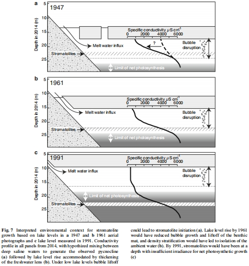 疊層石記錄了湖面上升期間的環境變化:喬伊斯湖的疊層石生長于一個變化的環境中,其同位素組成忠實地記錄了伴隨湖面上升而發生的光照、水體分層和化學條件的變化。