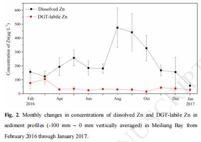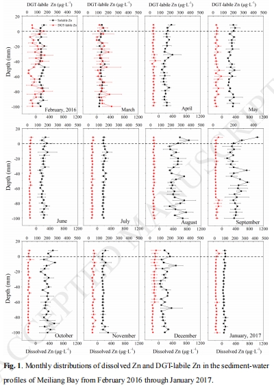 數(shù)據(jù):通過HR-Peeper和DGT獲取的月度溶解態(tài)Zn和DGT有效態(tài)Zn的垂直分布濃度(-100 mm至上覆水)。