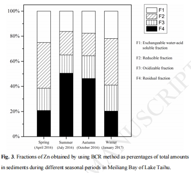 研究意義:揭示了Zn在沉積物中的賦存形態(tài)和潛在活性。數(shù)據(jù)顯示可還原態(tài)(與Fe/Mn氧化物結(jié)合)是Zn的重要儲(chǔ)庫,其比例變化(如夏季降低、冬季升高)為解釋溶解態(tài)Zn的季節(jié)性釋放和固定提供了關(guān)鍵依據(jù)。