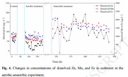 好氧-厭氧實(shí)驗(yàn):采集梅梁灣沉積物,通過交替通入氧氣和氮?dú)猓M氧化還原條件變化,并利用Rhizon采樣器監(jiān)測孔隙水中Zn、Mn、Fe的濃度變化(圖4)。