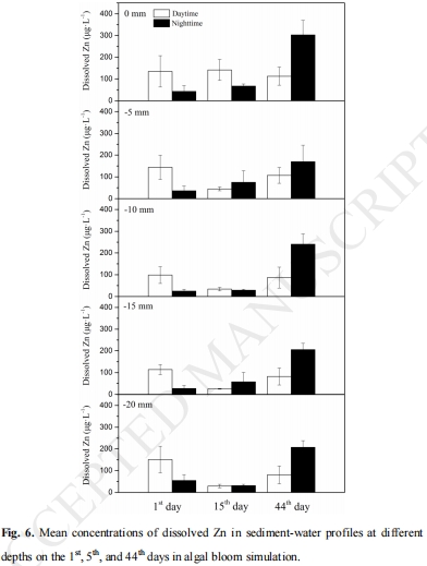 數(shù)據(jù):模擬藻華不同階段(初始、爆發(fā)、降解),沉積物不同深度及上覆水中溶解態(tài)Zn濃度的晝夜變化。