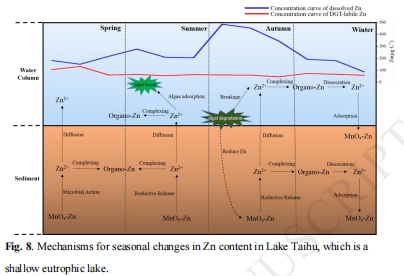 藻華降解期(8-10月):藻類殘?bào)w分解消耗氧氣,創(chuàng)造還原環(huán)境,導(dǎo)致沉積物中Mn氧化物還原,同時(shí)釋放大量DOM,兩者共同作用(還原釋放+DOM絡(luò)合)極大地促進(jìn)了Zn向水體的釋放和遷移。
