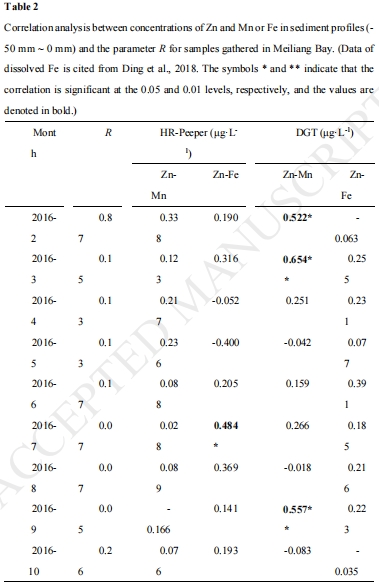 研究意義:直接、高分辨率地量化了鋅在沉積物-水界面的生物有效性和遷移潛力。數(shù)據(jù)顯示了Zn濃度的顯著季節(jié)性波動(dòng),為揭示其遷移規(guī)律提供了最核心的證據(jù)。DGT有效態(tài)Zn與溶解態(tài)Zn的比值(R值)反映了沉積物固相對(duì)Zn的再補(bǔ)給能力。