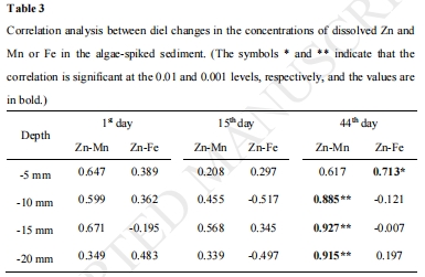 研究意義:揭示了藻華生命過程對(duì)Zn遷移的復(fù)雜影響。數(shù)據(jù)顯示,藻華生長期(第1天)Zn白天被吸收,降解期(第44天)Zn夜間大量釋放,并與Mn釋放顯著相關(guān),證實(shí)了藻類活動(dòng)通過改變微環(huán)境(耗氧、產(chǎn)生DOM)間接但強(qiáng)烈地驅(qū)動(dòng)了Zn的遷移。