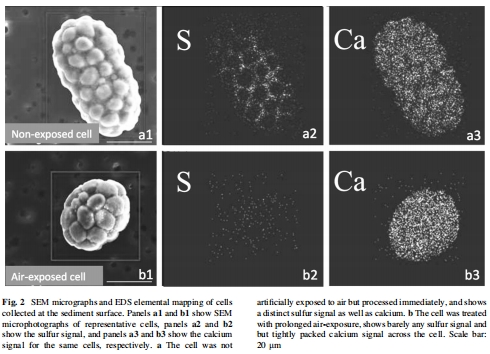 數據:EDS測量的重量百分比比。新鮮細胞S:Ca高(表層0.105,深層0.161);氧氣暴露細胞S:Ca低(表層0.025,深層0.035)。