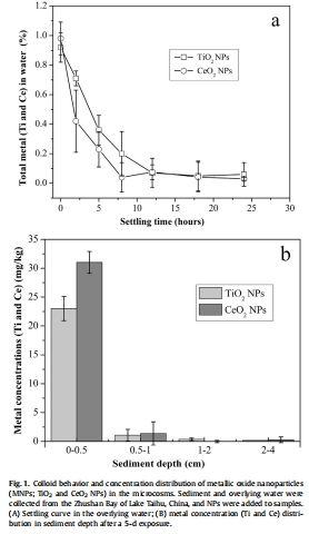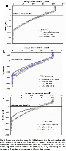 在最表層沉積物(0-1500 μm),生物氧消耗顯著被MNPs抑制,CeO2 NPs的急性毒性比TiO2 NPs更強。