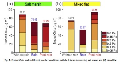 研究意義:直接量化降雨對沉積物和MPB可蝕性的影響。數據顯示降雨增加沉積物侵蝕但減少MPB侵蝕,揭示降雨的物理擾動和生物響應差異。例如,圖4顯示降雨條件下侵蝕質量增加37-86%,圖5顯示侵蝕Chl-a在降雨條件下減少。