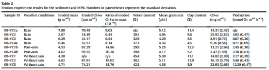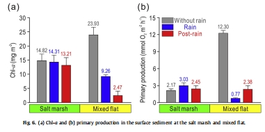 MPB可蝕性:降雨條件下,MPB可蝕性降低,總侵蝕Chl-a減少29%。在混合平坦區,降雨顯著降低了MPB的生物活性(生物量和初級生產),表層Chl-a濃度雨后減少73%。在鹽沼區,MPB生物活性穩定,降雨影響較小,可能由于植被冠層保留了侵蝕的MPB。