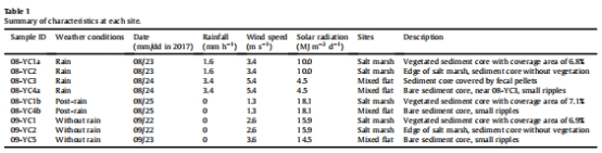 研究區域與采樣:選擇韓國慶州灣的鹽沼和混合平坦區作為研究點(圖1),在三種天氣條件(無雨、降雨、雨后)下采集表層沉積物樣本。