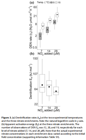 數據:rd范圍0.5-60.5 μmol N?O m?2 h?1,隨溫度和硝酸鹽增加而升高(5°C: 2.2-11.3;15°C: 6.6-27.0 μmol N?O m?2 h?1)。