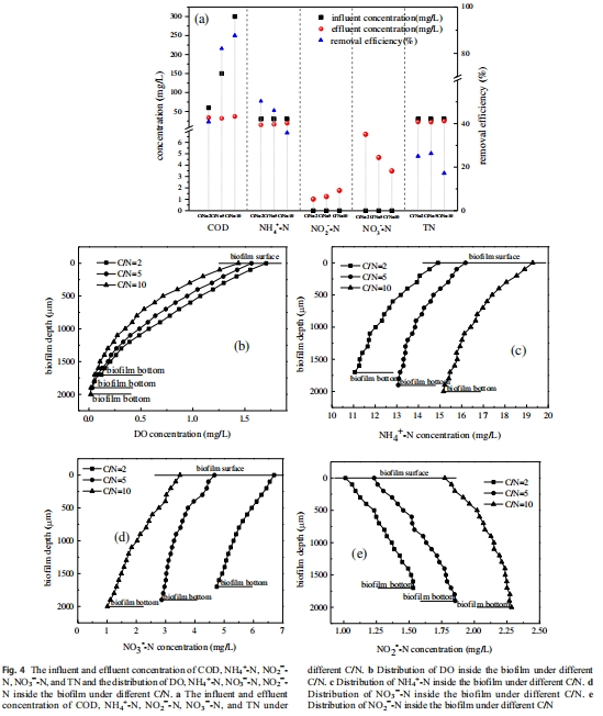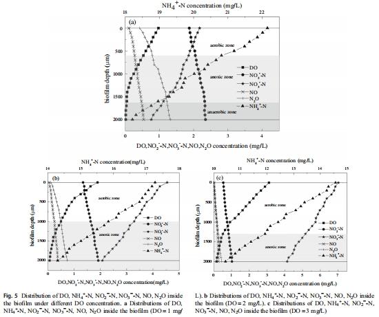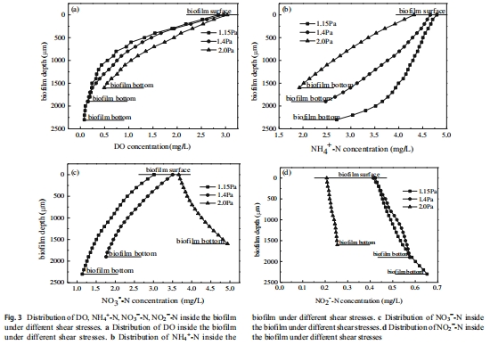 數(shù)據(jù):DO隨生物膜深度增加而降低(如1.4 Pa下,表層1.96 mg/L降至底層0.09 mg/L);NH??濃度遞減;NO??在低剪切下遞減,但在2.0 Pa下遞增;NO??在深層積累。