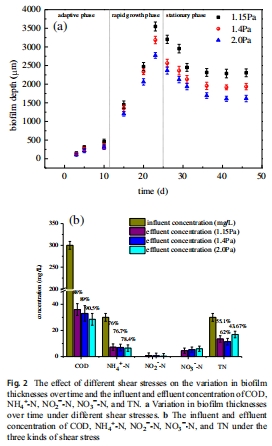 數(shù)據(jù):TN去除率隨剪切應(yīng)力變化(1.15 Pa: 55.1%; 1.4 Pa: 62%; 2.0 Pa: 43.67%);COD去除率隨C/N比提高而增加(C/N=2: 43.33%; C/N=5: 78.67%; C/N=10: 87.67%)。