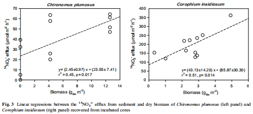 研究了兩種管棲底棲動物(端足類Corophium insidiosum和搖蚊幼蟲Chironomus plumosus)對富營養化河口沉積物中氮循環過程(硝化和反硝化)的物種特異性影響。通過結合過程特異性測量和凈通量分析,研究發現: