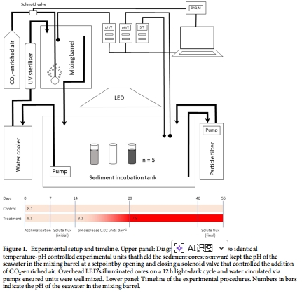 樣品采集與處理:從新西蘭北島沿海采集河口砂和亞潮汐淤泥的完整巖心,在實驗室中 submerged 于再循環海水系統(圖1)。系統分為控制組(pH 8.1)和處理組(pH 7.9),pH通過CO2富集空氣調節。