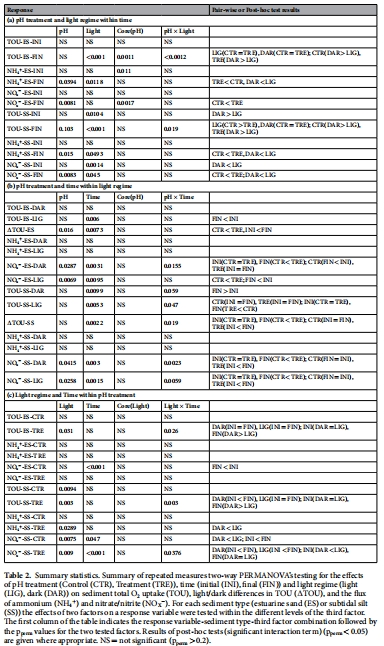 數據:PERMANOVA分析顯示pH、光暗和時間對通量有顯著交互作用(如pH對NOx-通量影響p<0.05)。