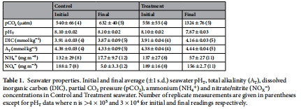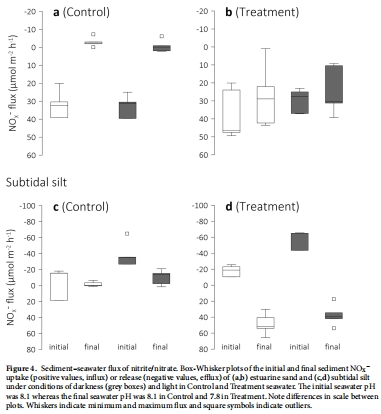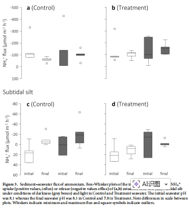 數據:海水NH4+和NOx-濃度在實驗期間變化。處理組(pH 7.9)的NOx-保留率更高(最終濃度為初始的82%),而對照組(pH 8.1)NOx-損失97%。