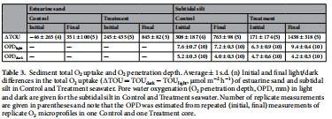 數據:河口砂的TOU在光暗條件下相似,但處理組最終TOU_light下降;淤泥的TOU_dark增加,處理組TOU_light變為負值(O2釋放)。