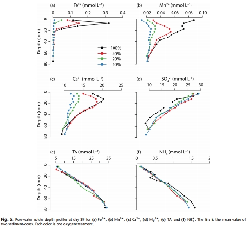 孔隙水地球化學(xué):第39天取樣分析Fe2?、Mn2?、Ca2?、NH??、SO?2?和總堿度(TA)的深度剖面(數(shù)據(jù)來自圖5)。