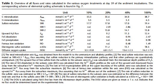 量化氧氣需求:DOU在高氧處理中更高(100% O2時DOU為16.2 mmol m?2 d?1,表3),證實氧氣可用性直接控制電纜細(xì)菌的電子接受效率。