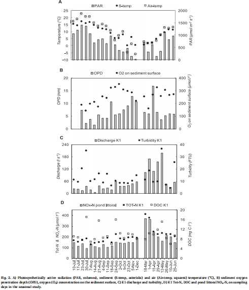 數(shù)據(jù)內(nèi)容:溫度(空氣/沉積物)、PAR、濁度、NOx-N濃度、DOC等季節(jié)性變化(如夏季PAR最高592 μmol m?2 s?1)。
