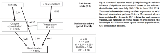 多因子耦合:SEM模型(Fig. 8)顯示溫度通過影響O?間接調(diào)控反硝化(路徑系數(shù)0.62),濁度通過降低光照增強(qiáng)反硝化。