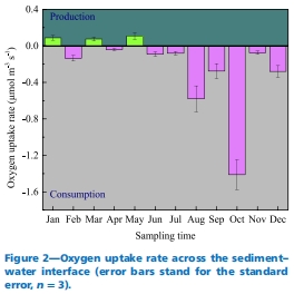 精準(zhǔn)量化氧化還原狀態(tài):Unisense的高分辨率數(shù)據(jù)揭示OPD常年偏低(<2 mm),證實(shí)沉積物表層即缺氧(Figure 1),打破了傳統(tǒng)假設(shè)的“氧化層”,解釋了為何Fe-P和NH?-N易溶解。OUR負(fù)值(Figure 2)進(jìn)一步驗(yàn)證沉積物為凈氧匯,微生物呼吸和有機(jī)質(zhì)降解耗氧強(qiáng)烈。