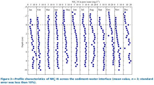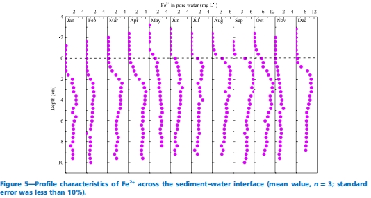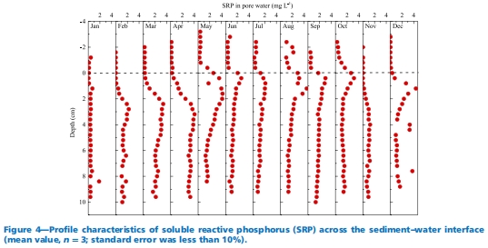 數(shù)據(jù)內(nèi)容:NH?-N濃度5-26.29 mg L?1(10月最高),SRP濃度0.01-4.87 mg L?1,F(xiàn)e2?濃度隨深度增加;三者均顯示從覆水向孔隙水遞增的梯度。