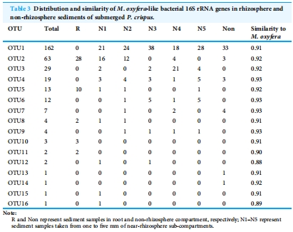普遍存在:M. oxyfera-like細菌在所有區(根際、近根際、非根際)均被檢測到,16S rRNA基因序列歸屬于16個OTUs。