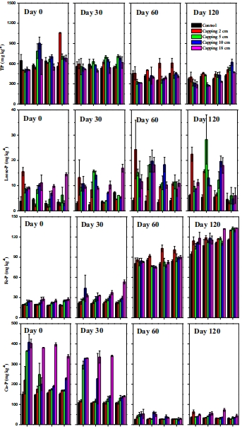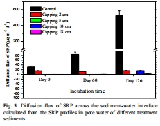 數據內容:覆蓋初期(Day 0)SRP通量從沉積物向上覆水擴散;120天后,厚覆蓋處理(10 cm和18 cm)通量反向(從水向沉積物),但對照和薄覆蓋(2 cm)通量達峰值。
