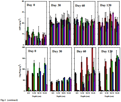 數據內容:TP和Ca-P含量隨時間下降(如Ca-P從初始~500 mg kg?1降至~300 mg kg?1),Fe-P含量上升(從~50 mg kg?1增至~150 mg kg?1);Al-P和Org-P變化不顯著。