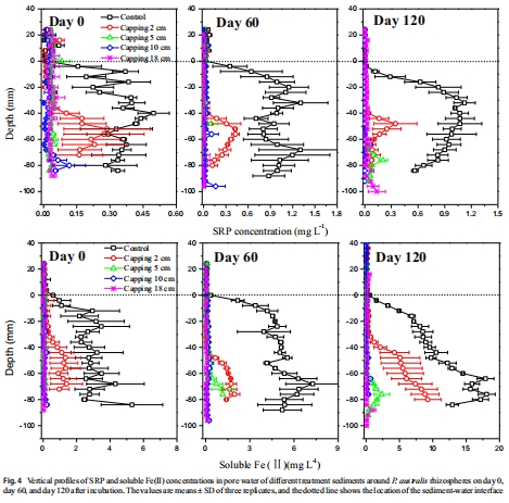 數據內容:SRP和Fe(II)濃度在沉積物表層(0-30 mm)呈現峰值分布;覆蓋處理中SRP濃度短期下降,但120天后顯著升高(如2 cm覆蓋處理SRP從~2 mg L?1增至~4 mg L?1)。