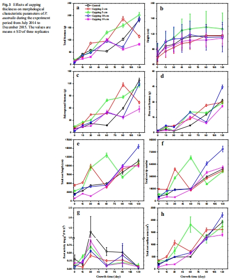 數據內容:蘆葦總生物量、根長、根表面積等指標隨覆蓋厚度增加而升高(如18 cm覆蓋處理生物量最高);根活性在實驗后期下降。