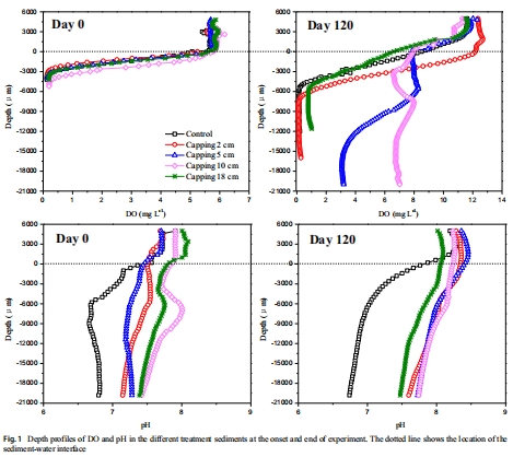 時空動態:實驗初期和末期對比(Fig. 1),顯示覆蓋處理下DO和pH的演變。