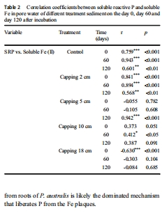 數據內容:SRP與Fe(II)顯著正相關(r > 0.9, p < 0.001),植物生物量與Fe-P正相關、與Ca-P負相關。